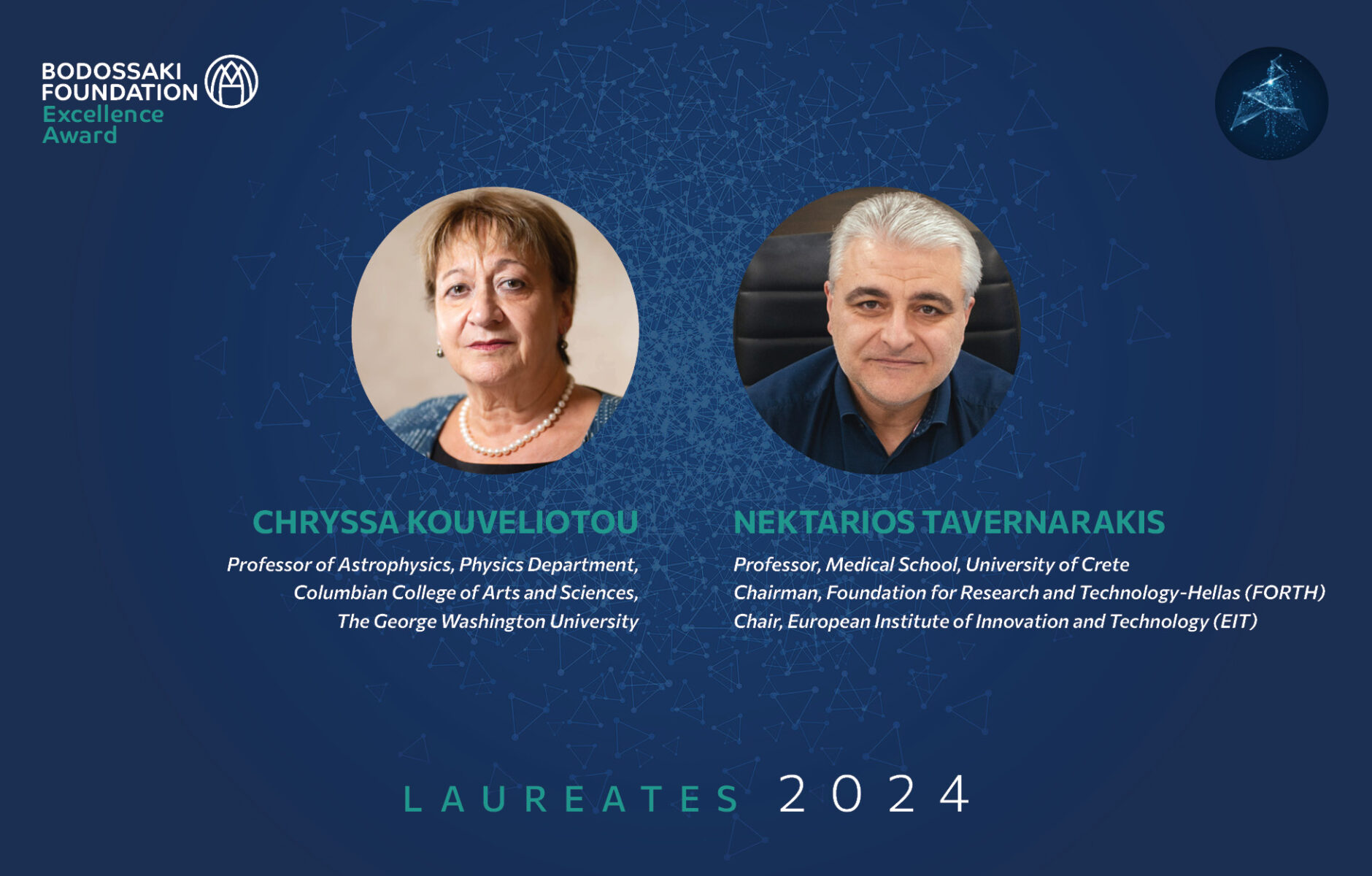 The Bodossaki Excellence Award for 2024 is awarded, in the field of Natural Sciences, to Chryssa Kouveliotou, Professor of Astrophysics in the Department of Physics at the Columbian College of Arts and Sciences at George Washington University and, in the field of Biomedical Sciences, to Nektarios Tavernarakis, Professor of Molecular Systems Biology at the University of Crete Medical School, President of the Foundation for Research and Technology-Hellas, and President of the European Institute of Innovation and Technology. The two Bodossaki Excellence Awards will be presented by the President of the Hellenic Republic, Katerina Sakellaropoulou, at a ceremony to be held at the Zappeion Hall on Tuesday 25 June 2024.