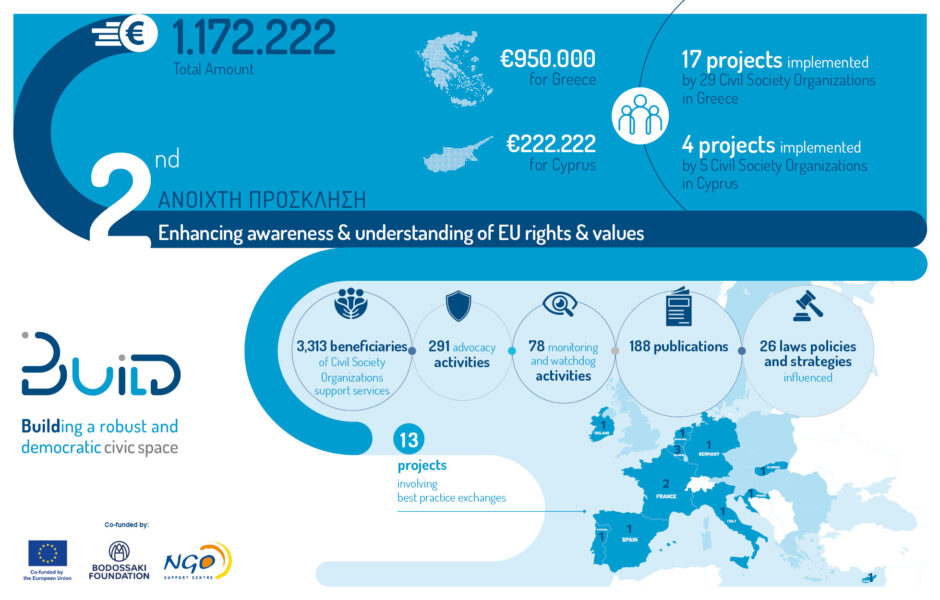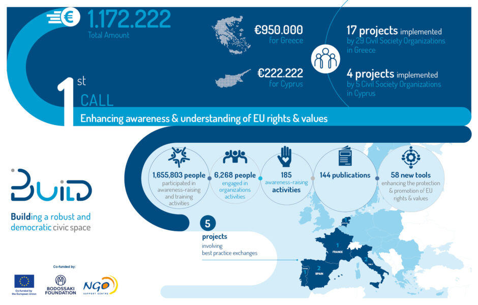With a total funding of €2.3 million, BUILD supported the implementation of 42 projects by 64 organizations in Greece and Cyprus, with the aim of protecting, promoting and widely recognizing the fundamental values and rights of the European Union, while strengthening the capacities and sustainability of civil society organizations (CSOs) in both countries.